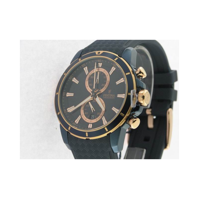 reloj FESTINA cabllero, quarzo, agujas,calendario, multifunción, caja de acero conchapado azul, bisel y esfera en azul condetalles cobrizos, correa caucho azul