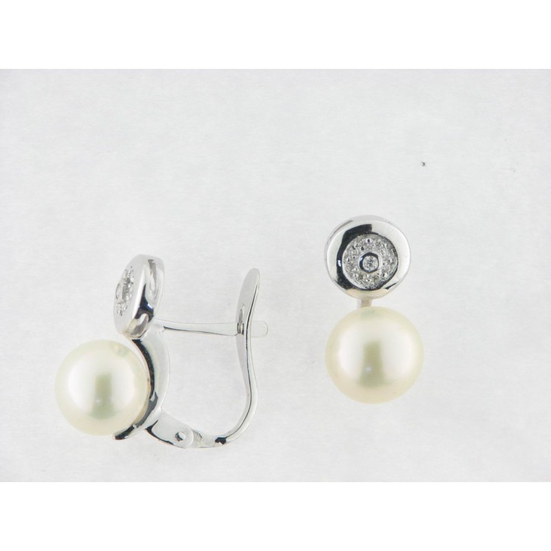 Pendientes en oro blanco 18 kts con perla cultivada 7mm, con diamantes talla brillante, cierre catalan. Tamaño 14 x 7 mm