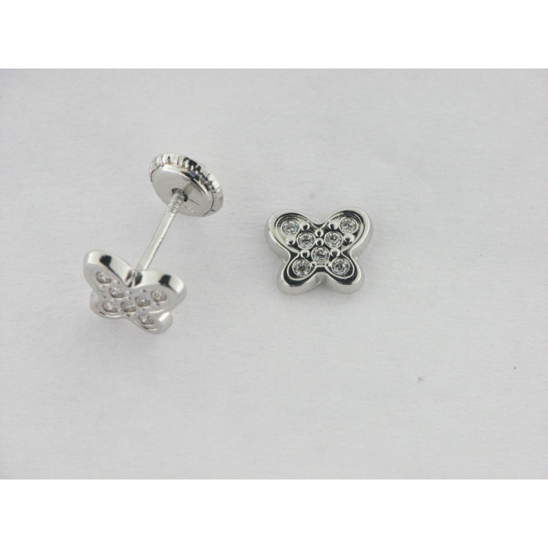 Pendientes en oro blanco 18 kts , mariposa con piedras, tuerca de rosca. Tamaño 5 x 7 mm