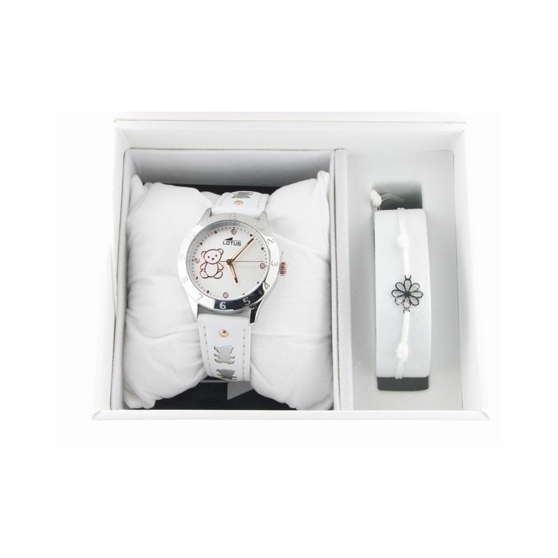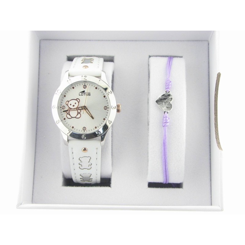 reloj LOTUS cadete, quarzo, agujas,caja de acero con esfera plateada y detalles en dorado-rosa, corra de piel blanca con detalles en gris plata