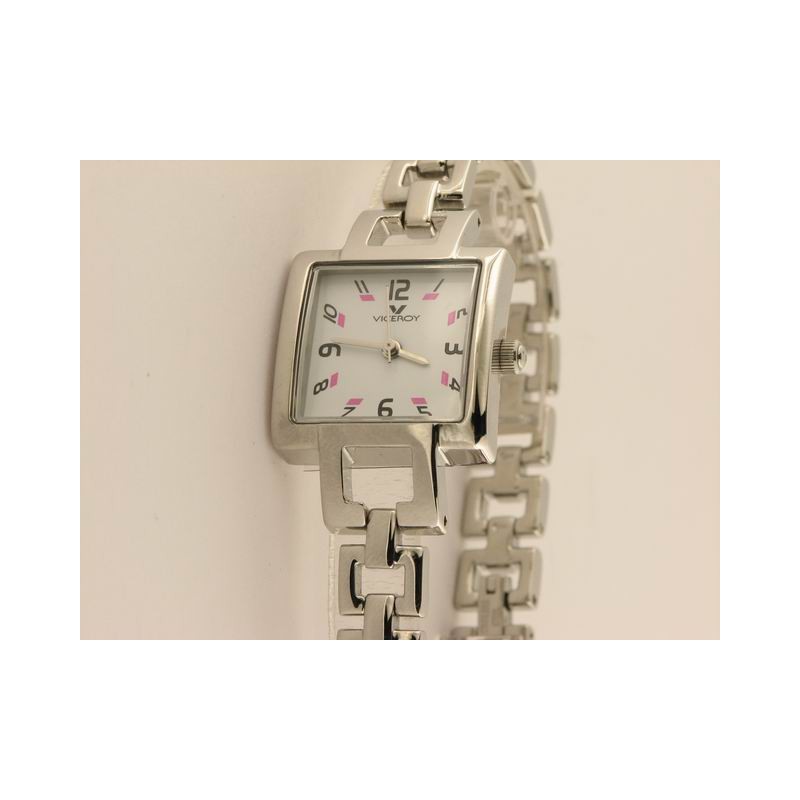 reloj Viceroy infantil, agujas, caja de acero con fondo de esfera blanco y detalles en negro y rosa, armys de acero