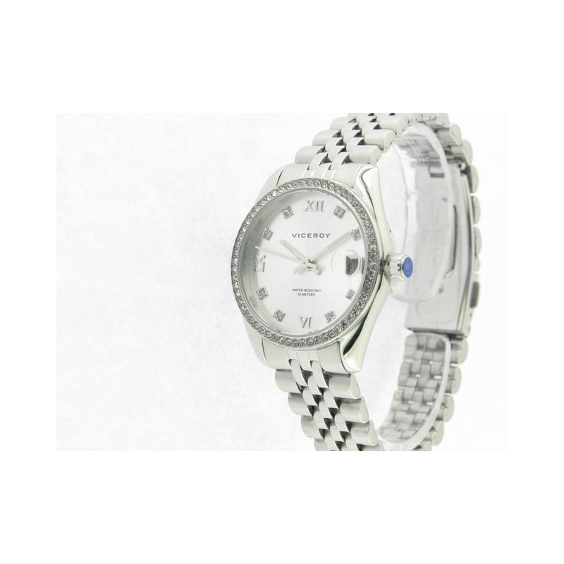 reloj VICEROY mujer, quarzo, agujas,calendario, caja y armys de acero con esfera plateada y detalle de circonitas en bisel y en esfera